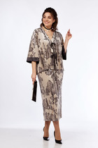 Костюм комбинированный двухпредметный: состоит из жакета и юбки. Жакет рубашечного типа прямого силуэта с асимметричным низом. Рукав втачной со спущенной линией плеча, фиксируется на пату. Застежка центральная на петли и пуговицы, смещённая по косой. На левой полочке накладной карман с клапаном. Воротник отложной на стойке до половины спинки. Юбка - солнце макси с узким поясом. В боковых швах расположены карманы. Застёжка на петлю и пуговицу и молнию по спинке.
