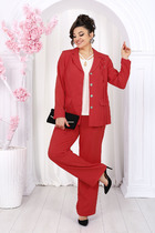 Костюм двухпредметный: состоит из джемпера и юбки. Джемпер-кейп прямого свободного силуэта. Горловина с цельнокроеным воротником-стойкой. Рукав втачной широкий, от линии локтя до запястья есть дополнительное отверстие для рук. Декорирован цветком из контрастной ткани. Юбка - солнце с узким поясом. В боковых швах расположены карманы. Застёжка на петлю и пуговицу и молнию по спинке.