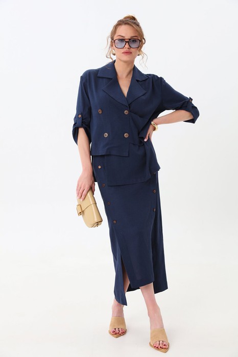 Костюм двухпредметный: состоит из жакета и юбки. Жакет прямого силуэта с имитацией центральной застёжки на пуговицы. Рукав втачной одношовный, длиной три четверти,застегивающийся на пату. Воротник пиджачного типа . Линия низа фигурная, симметричная . По левому переду расположена декоративная деталь. Юбка длиной миди, расклешенная к низу, с асимметричным низом. Пояс притачной, по спинке собран на резинку. Переднее полотнище состоит из трех частей. Правая часть скреплена отделочной строчкой и кнопками. В боковых швах изделия расположены карманы. По спинке изделия идёт средний шов и две вытачки для удачной посадки по фигуре. Юбка без подкладки.