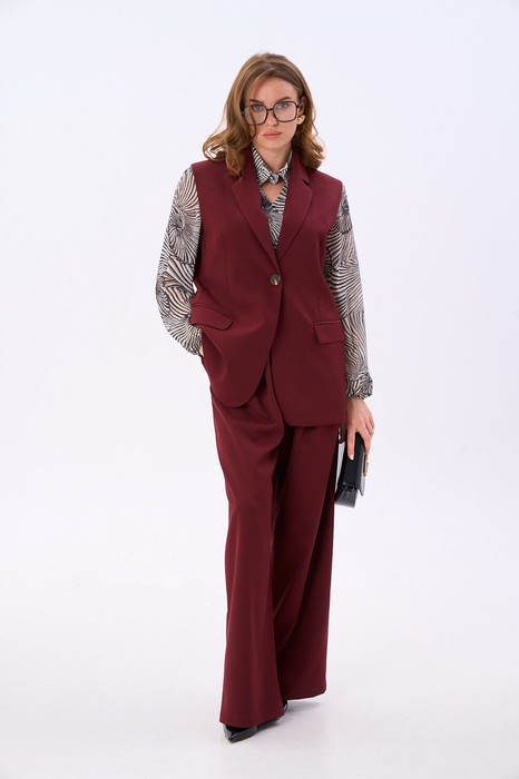 Костюм двухпредметный: состоит из жилета и брюк. Жилет однобортный прямого силуэта с застежкой на петлю и пуговицу. Воротник стояче-отложной с отрезной стойкой с лацканами.Изделие с отрезным бочком. Перед с талиевыми вытачками, с прорезными карманами в рамку с клапанами. Край борта со скруглением по низу. Спинка со средним швом, в котором обработана шлица. Изделие на подкладке.Элегантные брюки прямого кроя с боковыми карманами с отрезным бочком. Застежка на молнию и пуговицу. По переду - складки. Задние половинки с талиевыми вытачками и прорезными карманами с листочкой. Верхний срез обработан притачным поясом, по спинке собран на резинку. Низ обработан швом в подгибку.