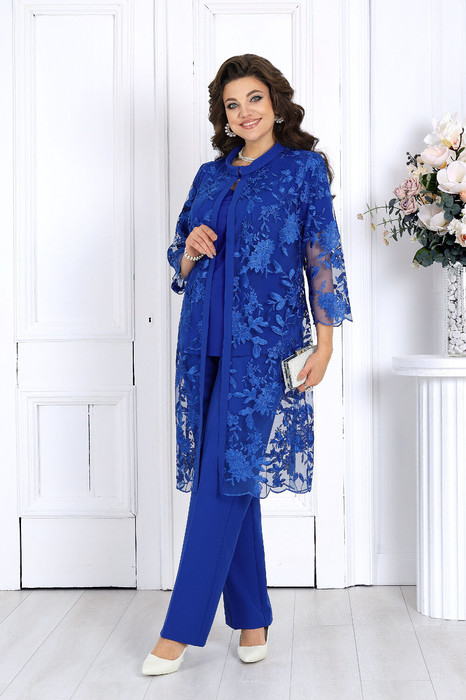Комплект брючный 3-х предметный, состоящий из кардигана, выполненного из гипюра, джемпера, выполненного из трикотажного полотна «масло» и брюк, выполненных из костюмно-плательной ткани. Кардиган, полуприлегающего силуэта, длиной по середине спинки 107 см от шва втачивания воротника. Перед с нагрудными вытачками, выходящими из пройм. Борта переда обработаны притачными планками из костюмно-плательной ткани. Спинка с талиевыми вытачками. Низа переда, спинки оформлены фестонами. Горловина спинки и переда округлая, по переду углубленная, с воротником-стойкой. Концы воротника прямоугольной формы. Кардиган с застежкой на декоративный крючок на уровне воротника. Воротник выполнен из костюмно-плательной ткани. Рукава втачные, одношовные. Длина рукавов 51 см. Низа рукавов оформлены фестонами. Джемпер полуприлегающего силуэта, длиной по середине спинки 66 см. Боковые части переда с рельефами от горловины до низа, и центральной частью переда, переходящей в прямоугольный вырез горловины. Горловина переда и спинки округлая, углубленная, окантованная. Спинка с талиевыми вытачками. Рукава втачные, одношовные, длиной 21 см. Брюки классические, с посадкой на талии, на притачном поясе, с застёжкой на тесьму-«молния», расположенную в среднем шве передних половинок, и 1 петлю и 1 пуговицу на поясе. Передние и задние половинки брюк с талиевыми вытачками, идущими от пояса вниз, с заутюженными стрелками, с боковыми наклонными карманами на передних половинках. Для лучшего прилегания брюк в области талии в поясе со стороны спинки вставлена резинка.