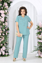 Комплект брючный 2-х предметный, состоящий из блузки и брюк. Блузка полуприлегающего силуэта, выполнена из вискозного полотна. Модель с плечевыми накладками и разрезами в боковых швах. Перед декорирован вставками с застроченными вертикальными защипами и отрезными фигурными планками, застегивающимися на 3 петли и 3 пуговицы. От планок к швам притачивания вставок направлены навесные петли, застегнутые на пуговицы. Спинка со средним швом; круглая горловина спинки обработана отрезной фигурной бейкой. Рукав короткий, втачной. Длина блузки – 66,5 (46-50 р-р) см, 69 см (52-60 р-р); длина рукава – 19,5 см (46-50 р-р), 20,0 (52-60 р-р) см. Брюки классические, с посадкой на талии, выполнены из вискозного полотна. Модель с центральной застёжкой на тесьму-«молнию», на притачном поясе, застегивающемся на петлю и пуговицу. Передние и задние половинки брюк с талиевыми вытачками, направленными от пояса вниз. Спереди обработаны боковые наклонные карманы. Для лучшего прилегания брюк в области талии в поясе по задним половинкам вставлена эластичная лента. Длина брюк по боковому (с поясом) – 101,5 см (46-50 р-р), 102,5 см (52-54 р-р), 103,5 см (56-60 р-р).