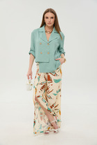 Комплект брючный 2-х предметный, состоящий из блузки и брюк. Блузка полуприлегающего силуэта, выполнена из вискозного полотна. Модель с плечевыми накладками и разрезами в боковых швах. Перед декорирован вставками с застроченными вертикальными защипами и отрезными фигурными планками, застегивающимися на 3 петли и 3 пуговицы. От планок к швам притачивания вставок направлены навесные петли, застегнутые на пуговицы. Спинка со средним швом; круглая горловина спинки обработана отрезной фигурной бейкой. Рукав короткий, втачной. Длина блузки – 66,5 (46-50 р-р) см, 69 см (52-60 р-р); длина рукава – 19,5 см (46-50 р-р), 20,0 (52-60 р-р) см. Брюки классические, с посадкой на талии, выполнены из вискозного полотна. Модель с центральной застёжкой на тесьму-«молнию», на притачном поясе, застегивающемся на петлю и пуговицу. Передние и задние половинки брюк с талиевыми вытачками, направленными от пояса вниз. Спереди обработаны боковые наклонные карманы. Для лучшего прилегания брюк в области талии в поясе по задним половинкам вставлена эластичная лента. Длина брюк по боковому (с поясом) – 101,5 см (46-50 р-р), 102,5 см (52-54 р-р), 103,5 см (56-60 р-р).
