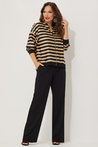 Брюки классические длинные, прямого силуэта, с посадкой на талии, выполнены из трикотажного полотна «велюр». Модель с центральной застёжкой на тесьму-«молнию», на притачном поясе, застегивающемся на петлю и пуговицу. Передние и задние половинки брюк с талиевыми вытачками, направленными от пояса вниз. Спереди обработаны боковые наклонные карманы. Для лучшего прилегания брюк в области талии в поясе по задним половинкам вставлена эластичная лента. Длина брюк по боковому (с поясом)-107 см (52-54 р-р), 108 см (56-60 р-р).