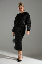 Кардиган полуприлегающего силуэта, комбинированный. Модель без плечевых накладок. Перед с отрезной планкой из основной ткани по борту и застежкой на 10 навесных петель и пуговиц. Спинка на подкладке, со средним швом и рельефами, направленными от плечевых швов до низа. Рукав длинный, втачной, с притачной замкнутой манжетой по низу. Перед и рукава выполнены из гипюра; планки, манжеты и спинка-из основной ткани. Длина кардигана-104 см, длина рукава-60 см.