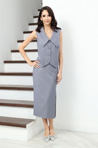 Брюки классические, длинные, прямого силуэта, с посадкой на талии, выполнены из ткани «крэш-вискоза». Модель без стрелок, с центральной застёжкой на тесьму-«молнию», на притачном поясе, застегивающемся на петлю и пуговицу. Спереди обработаны наклонные боковые карманы. Передние и задние половинки брюк с талиевыми вытачками, направленными от пояса вниз. Для лучшего прилегания брюк в области талии в поясе по задним половинкам вставлена эластичная лента. Длина брюк по боковому (с поясом) --107 см (50-52 р-р), 108 см (54-58 р-р).