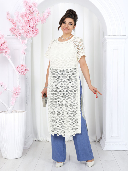 Туника полуприлегающего силуэта, выполнена из хлопкового кружева. Модель без застежки, без плечевых накладок, с высокими (от талии) разрезами в боковых швах. С изнанки разрезы обработаны хлопковой тесьмой в цвет кружева, закрепленной с лицевой стороны отделочной строчкой шириной 3 см. Круглый вырез горловины переда и спинки обработан обтачкой из костюмно-плательной ткани в цвет кружева; ширина отделочной строчки по горловине 2 см. Рукав втачной, короткий. Длина туники – 117 см; длина рукава – 22 см.