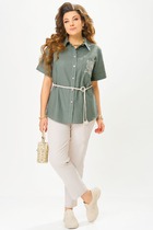 Платье женское, полуприлегающего силуэта, выполнено из костюмно-плательной ткани. Модель на трикотажной подкладке. С плечевыми накладками. Перед с рельефами, направленными от плечевых швов; в нижней части левого рельефного шва обработан разрез, по шву настрочена аппликация, дополненная перламутровыми бусинами. Спинка с рельефами, направленными от плечевых швов; в верхней части среднего шва обработана застежка на потайную тесьму-«молнию» (50см). Горловина круглой формы, углубленная спереди. Рукав втачной, короткий. Длина платья – 104 см; длина рукава – 23 см.