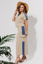 Юбка-полусолнце, с посадкой на талии, выполнена из поливискозного трикотажного полотна. Модель на трикотажной подкладке. В среднем шве заднего полотнища обработана застежка на потайную тесьму-«молнию» (20 см). Притачной пояс застегивается по спинке на 1 петлю и 1 пуговицу; для лучшего прилегания по линии талии предусмотрена эластичная лента, вставленная в пояс над боковыми швами. Длина по боковому (с поясом) - 95 см.