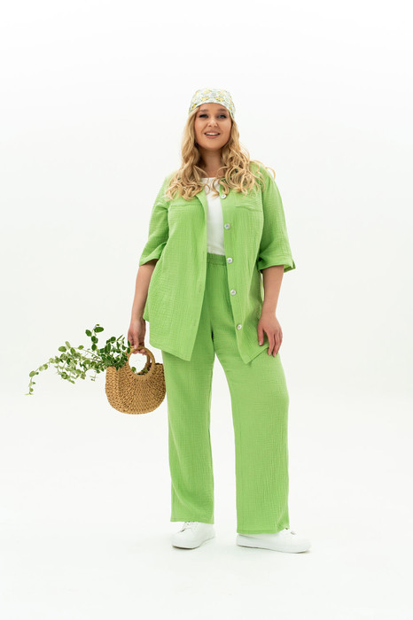 Ищете идеальный костюм, который сочетает в себе комфорт и стиль? Обратите внимание на наш женский брючный костюм из муслиновой ткани! Этот комплект станет Вашим незаменимым спутником как для домашнего отдыха, так и для прогулок на свежем воздухе. Изготовленный из 100% хлопка, он обеспечивает отличную воздухопроницаемость и легкость, что особенно актуально в жаркие летние дни. Муслин — это дышащий материал, который быстро сохнет, что делает его идеальным выбором для активных женщин. Вы сможете не беспокоиться о стирке, ведь этот комплект легко стирать и он не требует особого ухода. Костюм представлен в универсальном дизайне, который подойдет для любого повода. Стильный, яркий цвет добавит яркости в Ваш гардероб. Брюки на резинке с карманами-хулиганами в боковых швах. Силуэт брюк прямой. Рубашка дополнена накладными карманами по переду и кокетками на спинке и полочке. Перед и спинка рубашки - разноуровневые. Рукав с увеличенной линией плеча, длиной до локтя и с небольшими разрезами. На полочке пришиты пуговицы из натуральной ракушки.