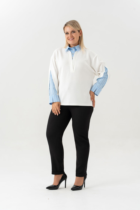 Практичный и удобный – он станет Вашим любимым костюмом, а трендовый дизайн делает его актуальным решением для девушек, которые следят за модой. Свитшот женский с имитацией рубашки- новинка коллекции. Изготовленный из качественного трикотажа и полоски на х/б основе, он обеспечивает дышащие свойства и гипоаллергенность, что особенно важно для женщин с чувствительной кожей. Подходит на осень, весну и для зимы. Ткань необычайно мягкая и приятная к телу. Свободный оверсайз крой изумительно подойдет для девушек и женщин больших размеров. На свитшоте обработан воротник и застежка –планка на петли и пуговицы. Рукав комбинирован из двух тканей, с манжетой и разрезом. Модель подходит для высоких и для невысоких. Брюки с удобной ,высокой посадкой и боковыми карманами позволяют хранить мелкие вещи, такие как ключи или смартфон, что делает этот костюм не только стильным, но и практичным. По низу брюк обработаны манжеты. Пояс частично на резинке, застежка на молнию и петлю с пуговицей.