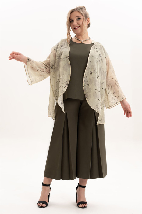 Прекрасный комплект, в состав которого входят брюки кюлоты, блуза и  шифоновый  кардиган. Лёгкая удлинённая накидка, блуза и кюлоты подходит для девушек любого возраста. Это универсальный комплект, который станет незаменимым в вашем гардеробе. Костюмная ткань, c которой пошиты кюлоты с хорошим стрейч-эффектом добавит комфорта при носке изделия. Кюлоты выполнены в стиле палаццо с укорочённой длиной, что делает её идеальной для любой поры года. Кардиган из шифона  свободного силуэта с  воротником стойка. В комплект к накидке идёт съёмный пояс. В боковых швах накидки есть небольшие, слегка переходящие на перёд  разрезы. Блуза выполнена с приятной на ощупь ткани. Спущенная линия плеча в сочетании с круглой горловиной невероятно женственная и изящна. В боковых швах также есть  разрезы. Удобные и комфортные брюки кюлоты  в этом комплекте- незаменимая в гардеробе вещь, которая подчеркнёт всю утончённость женской натуры и позволит всегда чувствовать себя комфортно. Перёд с застёжкой «молния», карманами в боковых швах, по линии предполагаемой стрелки разведена встречная складка, которая застрочена до линии бедра. Пояс в области боковых швов дополнен эластичной тесьмой. Они идеально сидят на фигуре благодаря свободной резинке, завышенной посадке. Укорочённый свободный крой брюк  прекрасно сочетается с различными верхами, позволяя создать повседневные, так и более нарядные образы на свадьбу, день рождения и другие торжества,