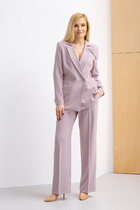Жакет с застежкой на планку со слегка смещенными пуговицами. Рукава съемные, пристегивающиеся с помощью пуговиц. Низ рукавов обработан манжетами на две пуговицы. На спинке – средний шов и горизонтальная кокетка. На переде – горизонтальная кокетка и накладные карманы. Низ изделия закругленной формы. Горловина оформлена стояче-отложным воротником с отрезной стойкой.