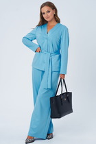 Комплект трехпрехпредметный, состоит из блузы, топа (бандо) и брюк. Выполнен из кружевного полотна.