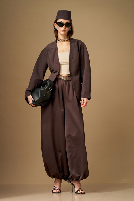Брюки свободной формы, с низкой посадкой, сильно расширенные и собранные снизу на резинку. Верхний срез обработан поясом на резинке, центральная часть переда без резинки. Брюки по силуэту называются «алладины».