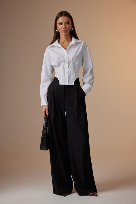 Брюки расширенные к низу, со складкой на передней половинке, застроченной сверху. Брюки с завышенной талией, верхний срез обработан обтачкой. В боковых швах наклонные карманы. На задних половинках по две талиевые вытачки, отстроченные отделочными строчками на 0,2см. Застежка на молнию и две отделочные пуговицы.