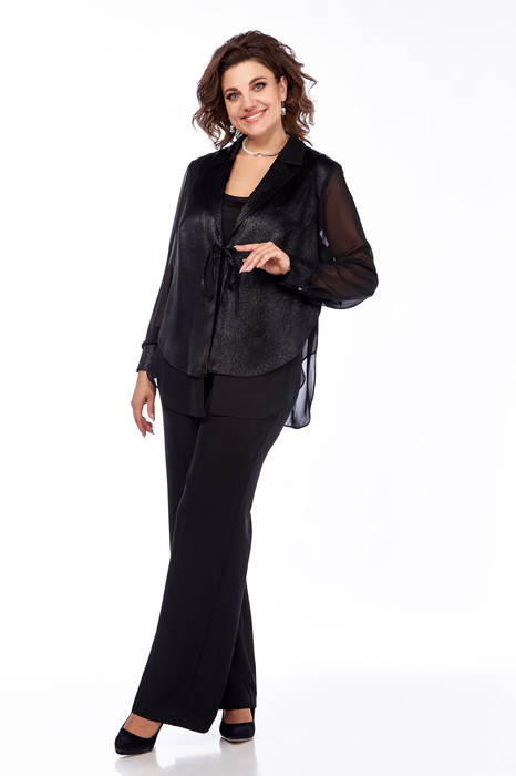 Нарядный трехпредметный комплект. Блузка полуприлегающего силуэта, комбинированная из двух блузочных полупрозрачных тканей, воротник пиджачного типа, застегивается на завязку, низ блузки фигурный. По спинке отрезная кокетка, от которой заложена бантовая складка. Рукав втачной длинный, на манжете с застежкой на петлю и пуговицу. Топ без рукавов с округлым вырезом горловины. Брюки прямого силуэта, пояс на резинке по спинке застежка на молнию, петлю и пуговицу. Карманы от пояса к боковому шву.