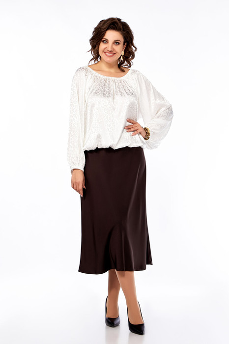 Нарядный комплект состоит из блузки и юбки. Блузка свободного силуэта с рукавами реглан. Верхний срез блузки на резинке, что дает возможность изменять горловину. Широкий рукав реглан. Низ рукава на резинке. Юбка клеш полусолнце длиной до середины икры. Сверху юбка на резинке.