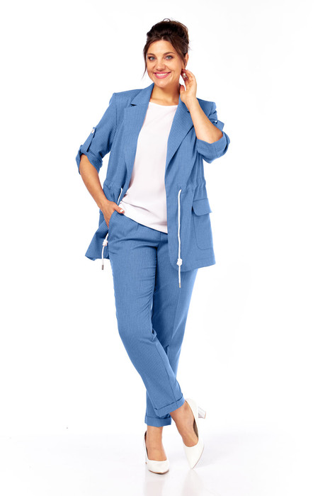 Летний комплект состоящий из жакета, брюк и блузы. Жакет прямого силуэта с пиджачным воротником, без подкладки и без застежки. По бокам накладные карманы  с клапанами. На правом клапане декоративная нашивка. По талии кулиска. Рукава втачные, длиной три четверти с патами. Брюки прямые, зауженные к низу, с отворотом, пояс притачной на эластичной тесьме с кулиской,  боковые карманы. Блуза прямого силуэта, рукав короткий.