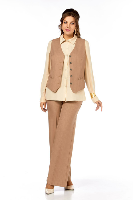 Комплект женский, состоит из блузки, жилета и брюк. Полуприлегающий силуэт, жилет с V-образной формой горловины, на переде рельефы от проймы, имитация карманов в рамку, по спинке хлястик с пуговицей. Блузка с рубашечным воротником и застежкой на петли и пуговицы, нагрудные вытачки, рукав одношовный с манжетой. Разрезы в боковых швах. Брюки прямые, с карманами. Пояс по спинке на резинке. На переде и спинке заутюжены стрелки.