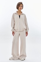Костюм женский спорт-шик. Джемпер прямого силуэта, со спущенным рукавом. Воротник-стойка из отделочной ткани, планка по центру, в которой вставлена молния, декаротивная нашивка. Рукав с планками из отделочной ткани и декоративные защипы на манжетах. По низу кулиска с фиксаторами. Брюки прямые, по переду застрочены стрелки, по внешней стороне отделочные детали с разрезами по низу. Карманы в боковых швах, пояс на резинке.