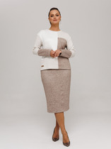Стильный костюм, из сочетания двух видов ткани. Жакет из мягкой плотной костюмной ткани, прямого силуэта. Пиджачный воротник, двубортная застежка, карнамы с клапанами. Слева вверху декоративная листочка. По спинке шлица. Рукава втачные, внизу шлицы и пуговицы. Брюки прямые, пояс по спинке на резинке, карманы в боковых швах. Заутюжены стрелки.