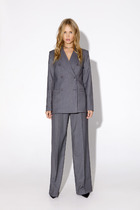 Текстильный костюм-двойка из классического двубортного жакета и прямых брюк-палаццо со стрелками.