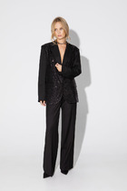 Комплект-двойка из оверсайз жакета с отделкой из пайеток и прямых брюк-палаццо со стрелками. Детали: жакет прямого силуэта, расширенная линия плеч, пиджачный воротник, перед с прорезными функциональными карманами, однобортная застежка на петли и пуговицы, спинка со средним швом и шлицей, рукава втачные двухшовные, жакет на подкладке. Брюки с высокой посадкой на притачном поясе со шлевками, застежка на молнию и пуговицу, боковые карманы, передние половины с заутюженными стрелками и двумя небольшими складками.