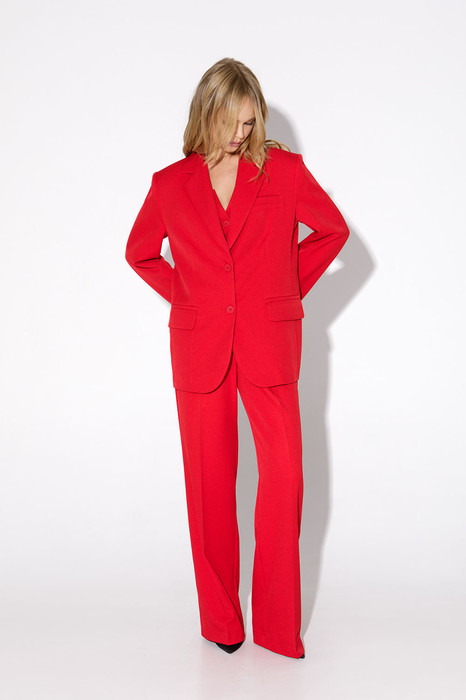 Костюм-двойка из оверсайз жакета с расширенной линией плеч и прямых брюк-палаццо со стрелками. Детали: жакет прямого силуэта, пиджачный воротник, перед с прорезными функциональными карманами, однобортная застежка на петли и пуговицы, спинка со средним швом и шлицей, рукава втачные двухшовные, жакет на подкладке. Брюки с высокой посадкой на притачном поясе со шлевками, застежка на молнию и пуговицу, боковые карманы, передние половины с заутюженными стрелками и двумя небольшими складками.