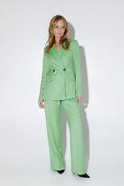 Классический костюм-двойка из двубортного жакета и укороченных брюк со стрелками.