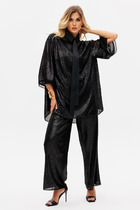 Длина жакета по спинке около 72 см в размерах 40-46 и около 74 см в размерах 48-52, длина рукава около 61,5 см. Длина брюк по боковому шву с поясом около 99 см в размерах 40-46 и около 100,5 см в размерах 48-52, длина по внутреннему шву около 69,5 см