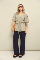 Детали: жакет свободного покроя и полуприлегающего силуэта, застежка на петли и пуговицы, функциональные карманы, жакет на подкладке. Брюки с высокой посадкой на притачном поясе со шлевками, застежка на молнию и пуговицу, боковые карманы, передние половины с заутюженными стрелками и небольшими складками.