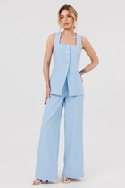 Текстильный костюм-двойка из приталенного двубортного жакета и юбки «карандаш» с высоким разрезом.