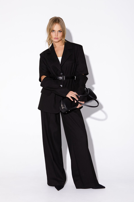 Текстильный костюм-двойка из оверсайз жакета с разрезами по рукавам и широких брюк-палаццо.