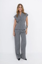 Детали: прямой силуэт, пиджачный воротник, функциональные карманы, застежка на петли и пуговицы, рукава втачные двухшовные, жакет на подкладке. Брюки с высокой посадкой на притачном поясе со шлевками, передние половины с небольшими застроченными мягкими складками и заутюженными стрелками, застежка на молнию и пуговицу, боковые карманы. Задние части брюк с вытачками и имитацией карманов.