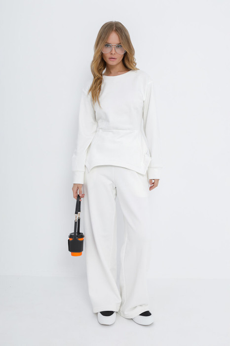 Детали: джемпер полуприлегающего силуэта, спущенная линия плеча, круглый вырез горловины, талия на резинке, застежка на потайную молнию в среднем шве спинки, рукава длинные с манжетами, фигурный низ. Брюки с высокой посадкой, эластичный пояс с резинкой, боковые карманы, без застежки. Костюм из трикотажа футер трехнитка.
