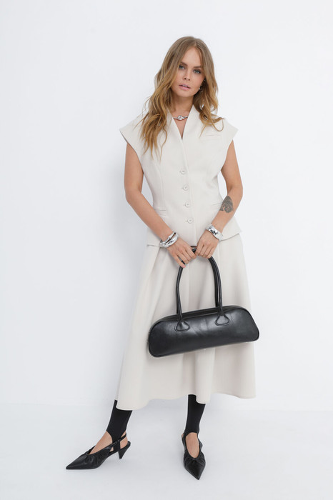 Текстильный костюм-двойка из приталенного жилета с воротником-стойкой и миди-юбки со складками.
