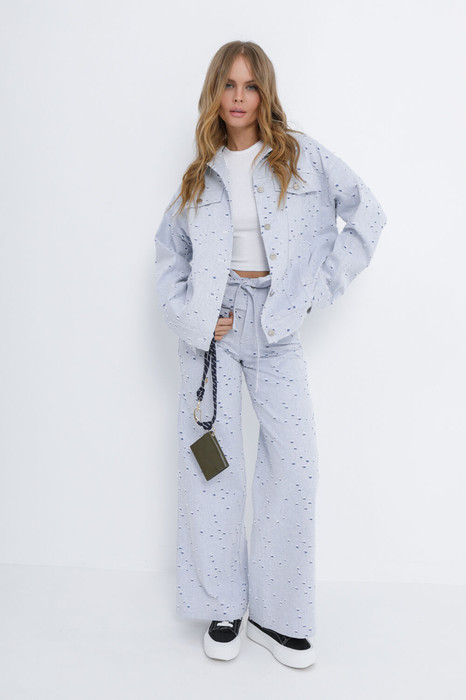 Костюм-двойка из свободной куртки-рубашки и широких брюк из хлопкового джинса с перфорацией.