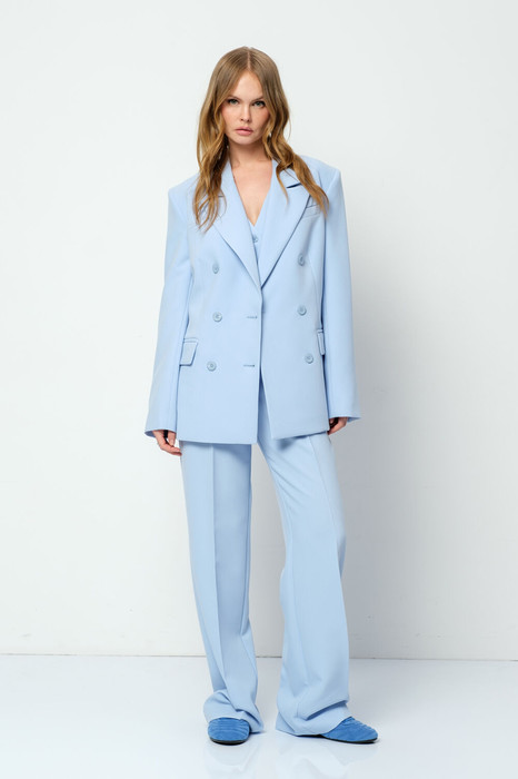 Детали: жакет свободного покроя и полуприлегающего силуэта, двубортная застежка на петли и пуговицы, отрезные бочки, пиджачный воротник, функциональные карманы, жакет на подкладке. Брюки с высокой посадкой, притачной пояс со шлевками, передние половины с небольшими застроченными мягкими складками и заутюженными стрелками, застежка на молнию и пуговицу, боковые карманы. Задние части брюк с вытачками и заутюженными стрелками. Пояс брюк прямой, без резинки.