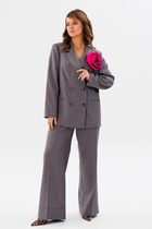 Детали: поло прямого силуэта, свободный покрой, спущенная линия плеча, потайная застежка на петли и пуговицы, длинные рукава. Широкие брюки-палаццо с небольшими складками у пояса и заутюженными стрелками, притачной пояс со шлевками, застежка на молнию и пуговицу, боковые карманы. Задние части брюк с вытачками и имитацией карманов.