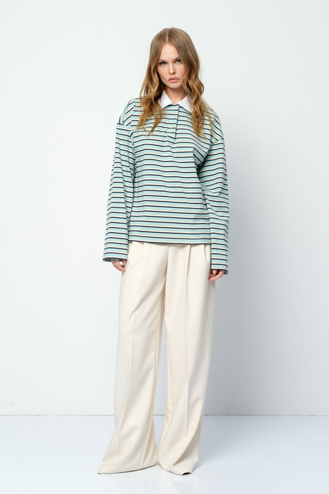 Комплект-двойка из свободного трикотажного поло в полоску и текстильных брюк-палаццо.