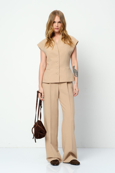 Костюм-двойка из приталенного жилета с воротником-стойкой и широких прямых брюк из текстильной ткани.
