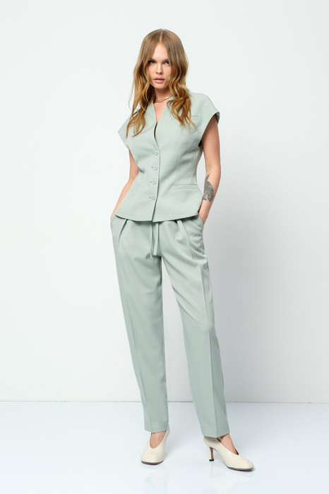 Костюм-двойка из приталенного жилета с воротником-стойкой и брюк со складками и поясом-резинкой.
