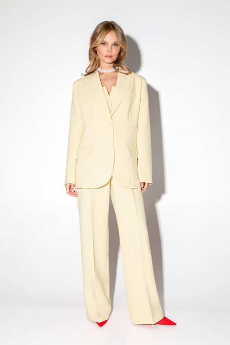 Костюм-двойка из оверсайз жакета с расширенной линией плеч и прямых широких брюк со стрелками.