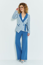 Длина жакета по спинке около 69 см в размерах 40-46 и около 72 см в размерах 48-52, длина рукавов около 62 см. Длина топа по спинке около 27,5 см в размерах 40-46 и около 29 см в размерах 48-52. Длина брюк по боковому шву с поясом около 113 см в размерах 40-46 и около 114,5 см в размерах 48-52, длина по внутреннему шву около 82 см