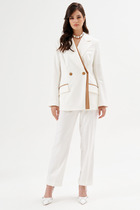 Детали: полуприлегающий силуэт, цельнокроеный воротник-стойка, рельефные швы переда и спинки, функциональные карманы, застежка на петли и пуговицы, жилет на подкладке. Брюки с притачным поясом со шлевками, передние половины с небольшими застроченными мягкими складками и заутюженными стрелками, застежка на молнию и пуговицу, боковые карманы. Задние части брюк с вытачками и заутюженными стрелками. Пояс брюк прямой, без резинки.