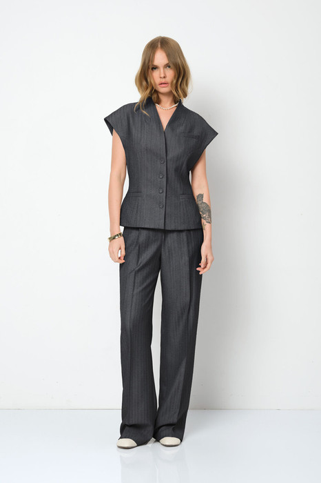 Костюм-двойка из приталенного жилета с воротником-стойкой и широких прямых брюк из текстильной ткани с рисунком «ёлочка».