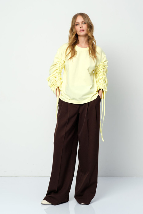 Комплект-двойка из трикотажного свободного свитшота с объемными рукавами и брюк-палаццо из текстильной ткани.