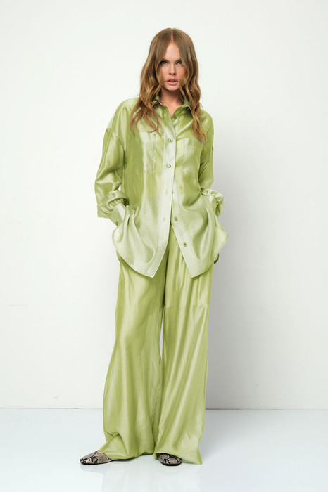 Полупрозрачный костюм-двойка из свободной рубашки и широких брюк на резинке.
