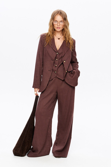 Льняной костюм-двойка в полоску из полуприлегающего жакета и широких брюк на резинке.